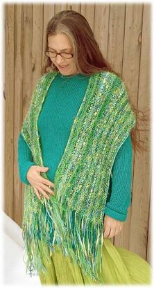 This is the easiest wrap yet. One yarn per row, knit stitches only with a grand total of a dozen increases in the whole piece, easy fringe. The whole piece is carried by the yarns, and there is subtle shaping at the top edge to keep it from falling off as you reach for something while wearing it.
