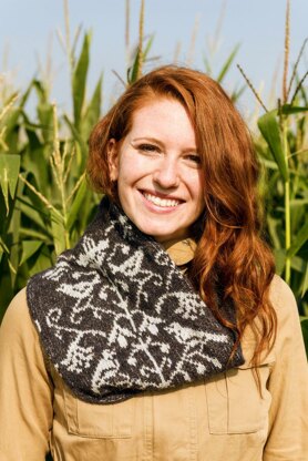 This circular scarf is worked entirely in the round from a provisional cast-on edge. The last round of the scarf is grafted to the provisional cast-on edge using Kitchener stitch. A half twist is created in the scarf by grafting the first stitch of the last round to the middle stitch of the cast-on. The colorwork pattern is presented in chart form only.