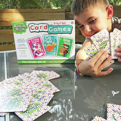 Engage the entire family with these favorite first card games! This classic three-in-one set includes: Crazy Eights, Go Fish!, and Slap Jack. Entice your young gamer with these easy-to-learn card games that enhance early learning skills, as well as strengthen social skills and strategic thinking, all while having lots of fun. This 10.75x7.5 inch package contains three illustrated 52-card decks with game instruction cards, storage box and tray. Recommended ages three years and up. Imported.