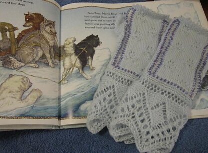 These mitts are the companion accessory to the Paws and Peaks Shawl. Beads highlight the sides of the frozen rivers the sled dog teams traverse after climbing over the mountains. You can choose to celebrate your dog or cat by choosing which paw prints will run across the hand of your mitts.