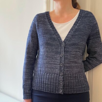 Payne’s Gray Cardigan is a classic V-neck cardigan with a broad ribbed hem and long sleeves. The upper back and the lower sleeves are embellished with twisted-stitch X’s. The cardigan is worked top down. After working the upper body to armhole depth, the sleeve stitches are put on hold and the straight lower body is finished. Stitches for the ribbed front bands are picked up along the fronts and neck edges. Buttons allow the cardigan to be worn closed. Finally, the sleeves are worked in the round.