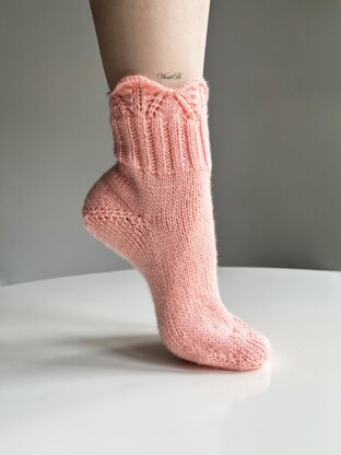 The Peachy Socks are cozy and warm socks for the cold winter days. They can be used as a sleepy socks or a home socks. On a small feet they will have a loosely fit. Peachy socks are worked in the round, top down from the cuff to the toe. These socks are knitted using a chart for the cuff and tiny heart pattern on upper toe side. I used a DK yarn and smaller needle size recommended for the yarn thickness as these are winter socks.