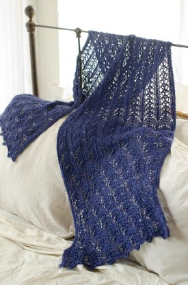 I wanted to design a shawl that incorporated traditional lace pat¬terns, reminiscent of peacock feathers, into a simple rectangular shawl. This is a good first lace piece for a confident knitter, but still has enough going on to maintain your interest if you’ve more experience. The shawl is very easy to resize; since all the repeats across the different stitch patterns are the same width, simply work more (or fewer) panels. Of course length is also easily changed by working more or fewer repeats of each stitch pattern. Worked in luxurious Blue Sky Alpacas Alpaca Silk, the Peacock Shawl would make a treasured gift – if you can bear to remove it from your own shoulders! Skills: Simple lace, grafting, reading charts