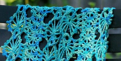 This pattern consists of two medallion strips up either side of the scarf with a lace inset panel connecting them. The lace inset can be widened to taste, or more medallion strips can be made and joined as you go.