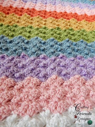 The Peaked Shell Afghan pattern is a simple design, quick to work up and has a fun texture to it. Working in 2 row sections of color, this afghan will have a chevron or ripple effect.