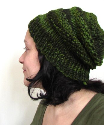 This chunky slouch beanie hat has three bands of moss or seed stitch (British moss stitch) sandwiched in between layers of stockinette stitch.