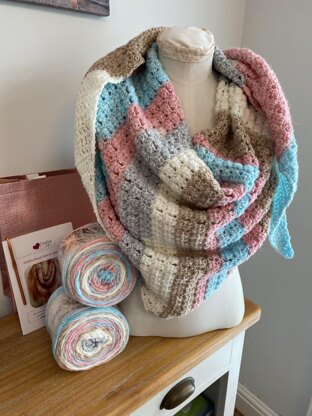 Pebble Beach Side to Side Shawl with King Cole Harvest DK yarn, a crochet pattern for a shawl constructed from one point of the triangle, increasing on one side to the centre then begin decreasing to make the second side of your triangle, third long side stays straight throughout.
