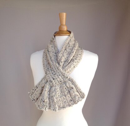 Braided cables and a tweed yarn… for a comfortable, stationary neck warmer. The natural tone keeps the focus on the stitch work, but another color could be equally lovely!