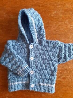 Baby hoodie, age 0-6 months, chest 16-18". Actual size chest 18", length 9", sleeve 6". Knitted in one piece to armhole in textured "pebble" pattern.