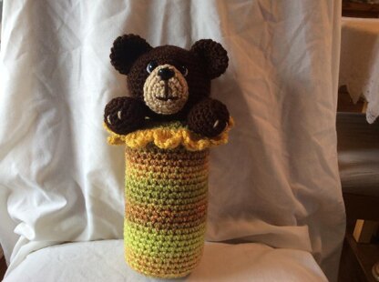 This is Peek-A-Boo Bear. His little head is popping out of a sunflower. He loves to play in a field of sunflowers. He can play peek-a-boo for hours.