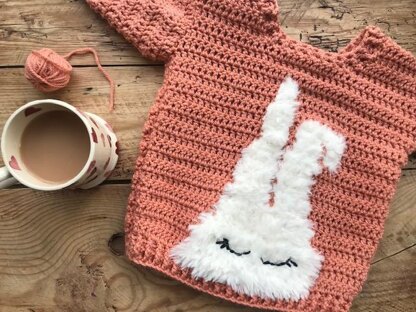The peeking bunny jumper is a lovely make, It contains nothing more taxing than a UK half treble crochet and whilst the fluff is a little fiddly to work with it also hides all manner of sins.