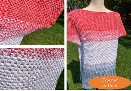 The pattern includes 9 sizes, so you can make it as roomy or as fitted as you desire. This tee is crocheted from the bottom up, in 2 panels. Then it is seamed together up the sides and across the shoulders, so it couldn't be any easier! The pattern includes both written and charted instructions.