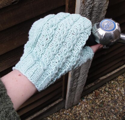 These fingerless mittens have been especially designed for cyclists. They feature a smart mock-cable pattern on the top, with a practical moss-stitch palm to provide extra grip and durability.