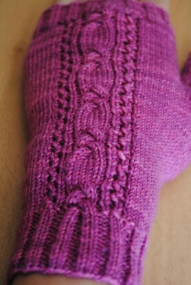 This pattern is a simple, elegant fingerless glove that shines in a solid or semi-solid yarn with a tight twist. It features a variation on the classic braid cable with a touch of lace for a delicate detail.