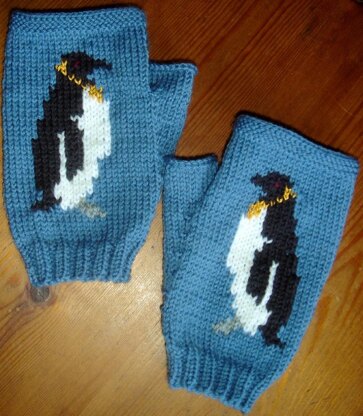 PDF knitting pattern for a pair of fingerless mitts/gloves with a penguin on the front of each mitt. The backs of the mitts are plain.