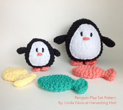 This pattern shows you how to crochet a stuffed penguin, penguin baby and fish. The finished penguin is approximately 4” (10.5 cm) tall and 4.25” (11 cm) across at the wings. The baby penguin is 2.5” (6 cm) tall and 3” (8 cm) wide across the wings. Each fish is 3” (8 cm) long and 1.5” (4 cm) across at the widest point. This pattern is written in English in standard American terms. It includes extra angled photos to help with assembly plus assembly instructions.