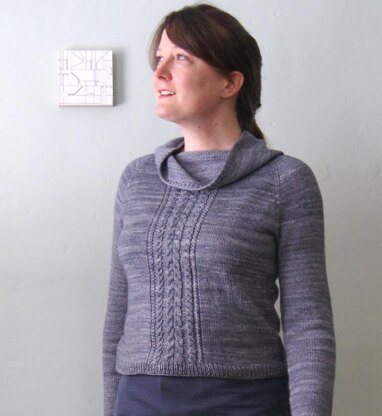 Pennyroyal is worked in the round from the top down with raglan shaping. A combination of simple cables forms a pretty panel down both the center front and center back. A drapey cowl neck tops it off.