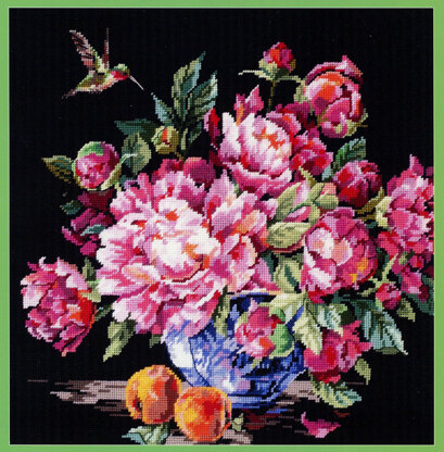Designed by: Nancy Rossi. A spectacular floral design of pink toned peonies in full bloom are the central subject in this chart, but the gorgeous humming bird and fruit details make it a great addition to any room.\n
