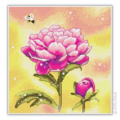 Peony Flowers Counted Cross Stitch. Easy to Follow Embroidery Chart featuring a very bright and colourful peony flower and a cute little bee. Great handmade gift idea for a family member or living room wall art decor.\n\nSize: 101w x 105h stitches\nStitched on Aida 14ct: approx 18 x 19 cm (7 x 8 in)\nDMC Threads: 21 solid colours (1 blend)\nUsed stitches: full cross stitch, half cross-stitch, backstitch, French knots (optional)\nSkill level: Easy / Beginner\nStitch time: 48-72h\n\nCross stitch pattern in PDF, Instant Digital Download includes: 1) cover page with preview; 2) instructions, symbols key and shopping list (DMC thread colour numbers and estimates, as well as fabric options); 3) two black and white charts, with and without backstitch; 4) two colour charts, with and without backstitch; 5) single page PDF for Pattern Keeper (available on request).\n\nPlease note: This pattern is for personal use only - not for commercial use. You can't make copies of our charts to distribute (either as PDF or printed versions) but you can definitely sell your finished cross stitch work.