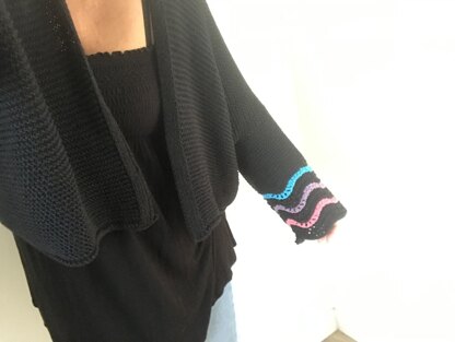 The cardigan is knitted seamless from top down It has wide sleeves with a colorful wave design and is oversized