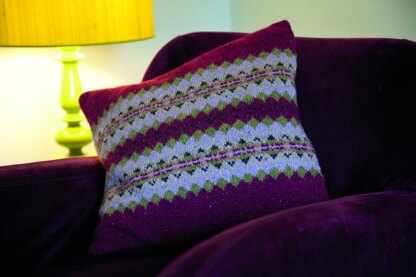 This square cushion has two Fairisle bands running across the centre of the cushion front, each with only two colours to a row. The back is knitted in two halves with a ribbed button and buttonband to close it. The cushion is knitted in six colours of Rowan Felted Tweed.