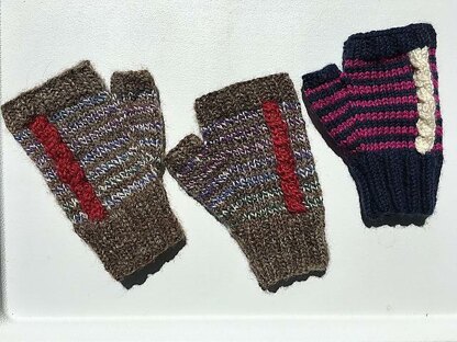 The handpsun mitts are an Adult M due to the density of the yarn while the mitts knit with commercial yarn are an Adult S. You can easily accommodate your handspun yarn of a different wpi by increasing (or decreasing) the size of the mitts by adding (or subtracting) multiples of 4 sts (for k2p2 ribbing)- 2 to the palm and 2 to the back side of the hand between the cable and the thumb.