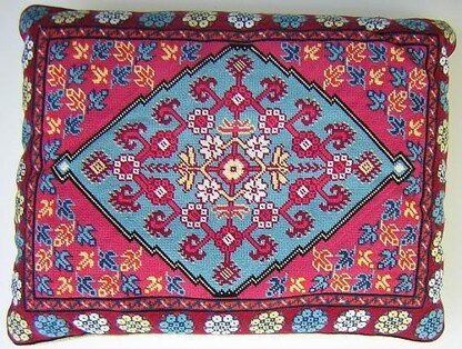 I originally charted this design for use as a rug in a doll house. I never got around to doing the rug, but did a pillow (pictured) instead.