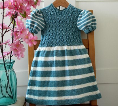 Pettit Fleur Baby Dress is a beautiful baby dress knitting in pieces and sewn together when finished. Bottom skirt and sleeves use folded hem. The skirt and sleeves are made using stocking stitch and the bodice is knitted using a lovely knitting diamonds design. Back dress has a small opening and button closure to make sure baby/toddler head enter comfortable inside the dress. Neckline is finished with 1x1 ribbing. Pattern include sizes for babies and toddlers, is a great knitting baby dress for all seasons