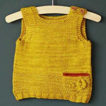 The Petites Feuilles Vest is an easy, fun knit that is perfect for layering. With its adorable constrasting secret pocket (optional), it’s also great to use up leftover yarn and it lends itself to many color combinations. The shoulder buttoning ensures that the garment is easy to put on and off.
