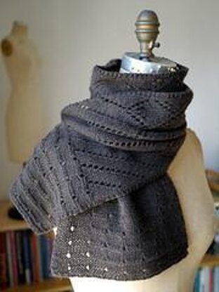 Perfect for unpredictable transition seasons, this pretty scarf in two sizes (P/T) knits up with a twist—unexpected lacy openwork to lighten the mood in warmer blustery weather. The combination of lace patterns is far easier to knit than it appears, with most wrong side rows worked entirely in purl. This is a great project for both beginners and for more experienced knitters on the go.