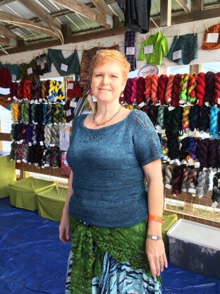 Yarn: Dragonfly Fibers Dance Rustic Silk [100% silk noil; 450 yards per 4 oz skein]; 2[2, 2, 2, 3, 3] skeins. Sample knit in Kelpie, size 44”, using 800 yards.