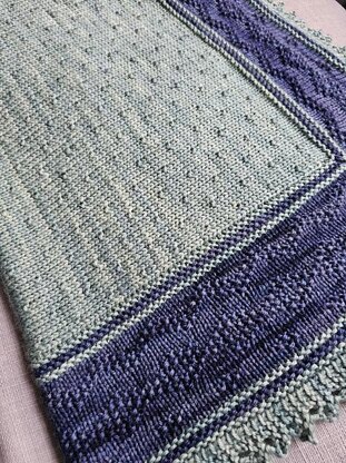 Phylida's Blanket is a textured and lace blanket. The centre square in knit flat, then the stiches are picked up around the sides and knit outwards. A knitted on lace edge provides the cast off.