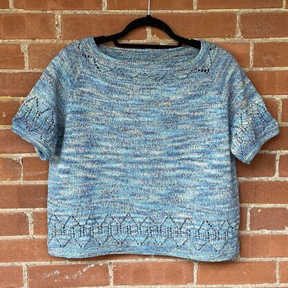 Picket Fences is a light, lacy tee that can be enjoyed all summer long. It features a flattering garter-edged neckline with a bit of whimsy. The garter edge “dips” down into the lace pattern making the neckline a point of interest with extra special detail. This feature is repeated again on the lower edge. The tee is worked from the top down and offers both medium- (or shorter-) length sleeves.