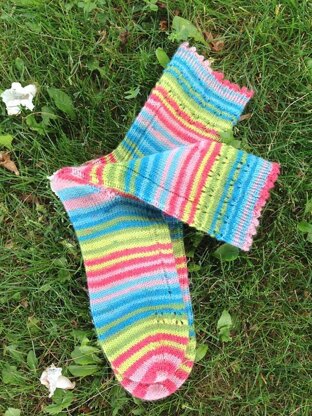 So sweet for your feet at any time of year, Picnic Socks are perfect for your summer knitting bag! Worked from the top down, they begin with a pretty picot cast on that resembles a little row of strawberries. Then you'll work a tiny garden of eyelets and continue with dropped stitch stripes. Another eyelet garden completes the toe. This is an easy to memorize pattern that knits along gently while you watch the happy Meadow Stripes unfold before your eyes.