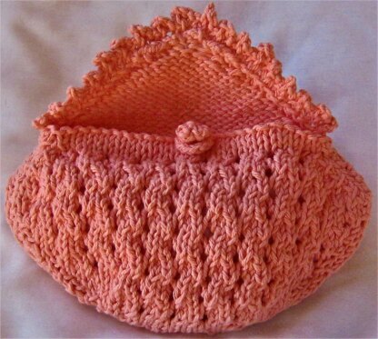 This clutch has a distinctive look with yarn overs forming delicate eyelets across the front surface. A small hem reinforces the top edge, giving it added structure. Its front, outward rounded shape, is subtle and formed by joining front to back on a slight offset. The back piece and front flap closure is worked as one and has a decorative picot edging as a highlight. The opening is secured with a loop which fits snugly around a small bobble--out of sight when closed.