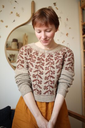 The pullover is knit top-down in the round with a floral colourwork pattern running down the yoke, body and part of the sleeve.