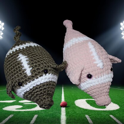 Bernat blanket yarn and K (6.5 mm) hook were used for the pink pigskin. Yarn Bee Dream Supreme and L (8.0 mm) hook were used for the brown pigskin.