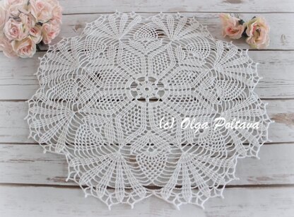 This is a pattern for a round crochet doily featuring pineapple design, made with cotton thread size ten (such as Aunt Lydia's) and a steel hook 1.5 mm. There are 29 rounds, and the finished doily measures about 17 inches in diameter (after blocking). The skill level is advanced beginner. It's not so much about difficult stitches (there aren't any really), but about being able to read each row very carefully and following the instructions. The pattern is written in English using the US crochet terminology. This pattern is my original design and it cannot be redistributed. However, you have the permission to sell finished items made from this pattern.