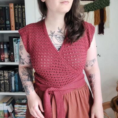 Techniques used : Wrap Top worked in pieces top down Upper back worked straight to armhole depth Waist decreases on the lower back Fronts picked up from back CO then worked with neck increases to total body length Garter stitch belt attached to live sts at the hem All over textured lace with eyelets and centered double decreases, maintained over shaping Garter and slipped stitch edges Mattress seam on the sides of the body Pattern includes written and charted instructions