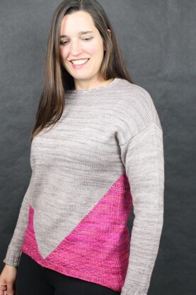 *Pink is a comfortable, drop-shoulder jumper. It is worked seamlessly from the top in one piece, beginning with the neck edge. The shoulder slopes are shaped with the use of the contiguous sleeve method. The front and back are worked separately down to the underarm. The body is formed by joining the front and back at the underarm. Finally, the sleeve stitches are picked up around the armhole edge and shaped using decreases. *
