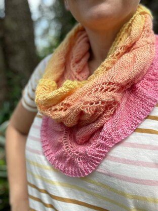 Pink Lemonade is named for the cheerful yellow to pink gradient of the White Birch Fiber Arts skein of baby alpaca yarn it is knit from. It is a simple pattern with a stunning result. A six round repeat with twisting increases and decreases creates a spiral of cables nestled into ruched panels. This is cowl is simple and spectacular, and perfect as a holiday gift for a special friend.