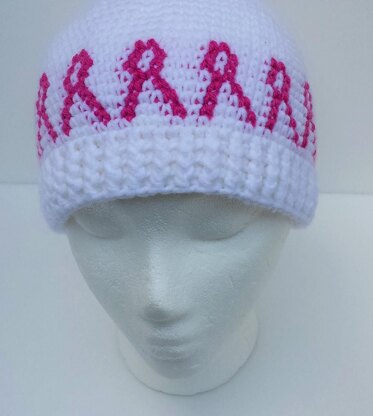 This pink ribbon chemo hat works up quickly in worsted yarn. Instructions include chart for ribbon motif. On paper, the ribbon looks crooked, but because of the way crochet stitches aren't perfectly aligned, it works up perfectly.