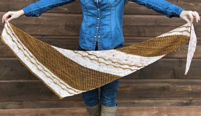 The Pinnacle Shawl is an offset triangle knit using two contrasting colors of DK weight yarn. The generous size of the shawl allows you to wrap it around you in so many ways. The color changes, striping and stitch patterns keep your interest while knitting!