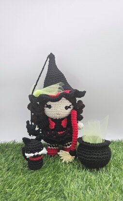 Finished size: Approximately 10” tall for Pippa with hat. 3” for Kitty Cat, 2” for Cauldron, and 5½” for broom. Size depends on what type of yarn and hook you use.