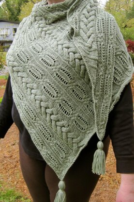 This sport weight triangular shawl incorporates two distinct cable stitches. One is a two row cable (Aran), so if you have never worked a two row cable, but would like to try, this may be the pattern for you. The other is a Japanese cable-lace stitch, and both are combined with a garter ridge stitch. It is knit bottom up to allow you to customize the shawl as you would like.