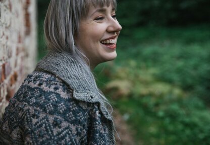 Pirta cardigan is worked top-down, in the round and seamlessly. The cardigan has a cowl neck and a round yoke with color work. The hem of the cardigan repeats part of the color work and hides pockets behind it. The cardigan has long sleeves and the hem is slightly cropped. Once the cardigan is finished, it is steeked, i.e., cut open and then, the button bands and pockets are worked to finish the garment.