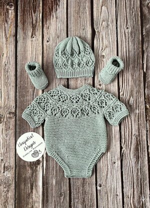 A beautiful 3 piece Romper set knitted with a simple eyelet stitch on the bodice . The romper is knitted from the top down and can be worn with the buttons at the back or front.