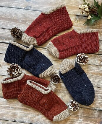 The design details are enough to be interesting and not fussy, with a pretty garter stitch ridge on the leading edge and a reverse stocking stitch cuff to ensure that the slippers stay in place without slipping off.