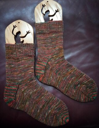 This pattern was made for the very beginner with sock knitting. It is a very easy knitting pattern with a slip stitch heel flap, gusset, longer cuff and kitchener stitch toe. I used some Christmas yarn for these socks and they are so soft and comfortable especially for not being a tighter sock and in a slightly bigger needle than some other sock patterns and if your feet sometimes swell like mine do.