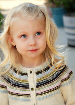 A perfect little everyday cardi with a fun striped yoke. This cardigan is knit from the bottom up in one piece with minimal seaming. This sweater is a great way to use up yarn scraps and the fun bright colors are sure to match and brighten up any outfit!